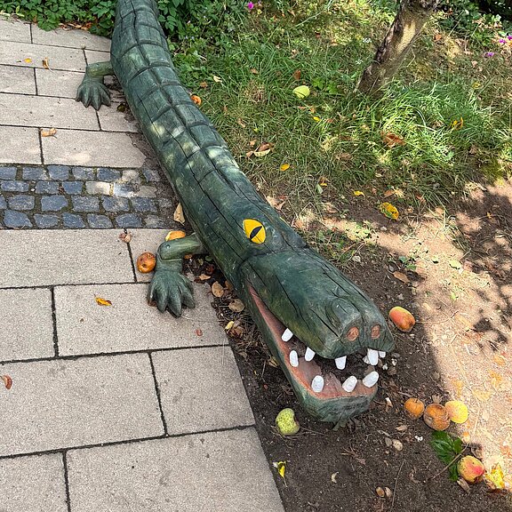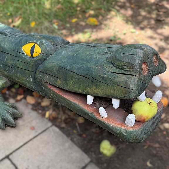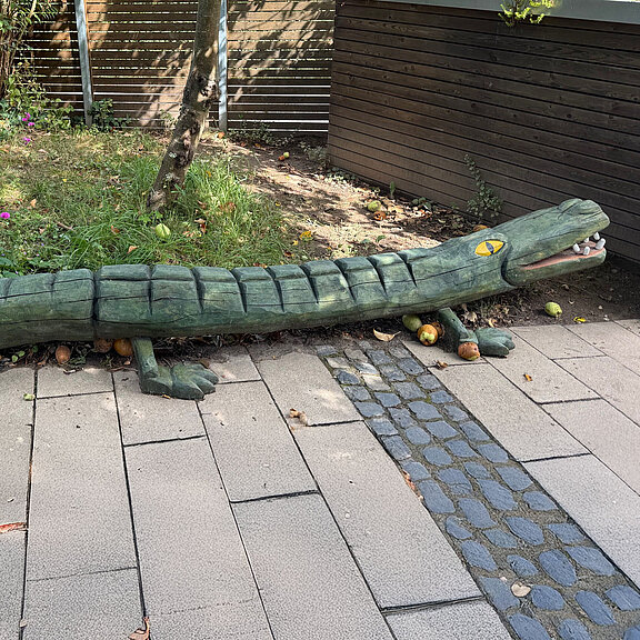 Auf der Wiese der Kindertagesstätte Schatzinsel in Bonn-Hoholz liegt seit dem 23.1.2025 ein neuer Freund: „Kroko“, das freundliche Krokodil.