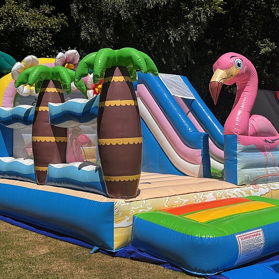 Die farbenfrohe Hüpfburg, liebevoll gestaltet mit einem fröhlichen Flamingo, sorgt künftig für mehr Bewegung, Freude und Leichtigkeit im Alltag der Kinder des Dr. Ehmann Kinderheims. Sie ist stabil, sicher und mit Schutznetzen ausgestattet – ideal für die Kinder und Jugendlichen des Hauses, die hier trotz körperlicher oder geistiger Beeinträchtigungen aktiv werden und einfach Kind sein dürfen.