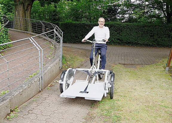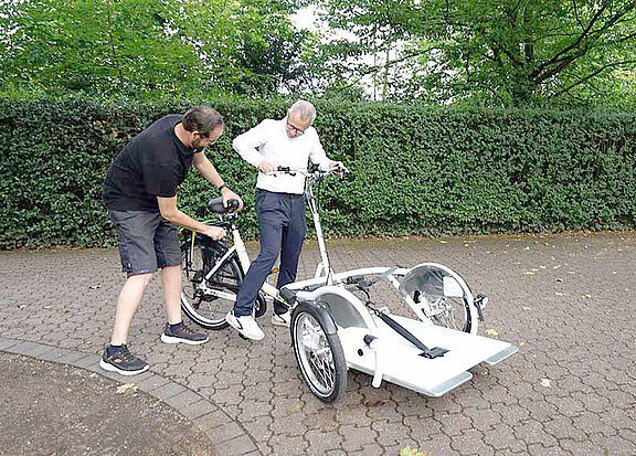 Dank der großzügigen Unterstützung der Bonner Partner der RSM Ebner Stolz Partnerschaft mbB, einer der großen deutschen Wirtschafts- und Steuerberatungsgesellschaften, konnte dieses Projekt realisiert werden. Die Übergabe des Rads wurde von den Partnern WP StB Torsten Janßen und WP StB Uwe Harr begleitet. Uwe Harr ließ es sich nicht nehmen, selbst eine Probefahrt zu machen – und bewies, dass auch ein nasser Rasen für das Rad kein Problem ist! Auch wenn Herr Bahles von der Firma e-mobil anfangs noch etwas nachhelfen musste.