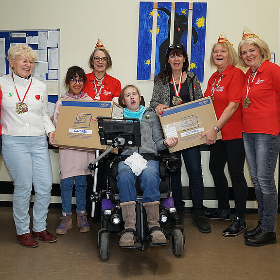 Zur Übergabe der Nähmaschinen erschienen vier Vertreterinnen des Damenkomitees, allen voran die Präsidentin Karin Michel. Auch Silvia Stelgens und Helmut Graf von der Stiftung Buntes Herz waren anwesend, ebenso die Schulleiterin Dr. Silke Hahno, die stellvertretende Schülersprecherin und eine weitere Schülerin der Frida-Kahlo-Schule.